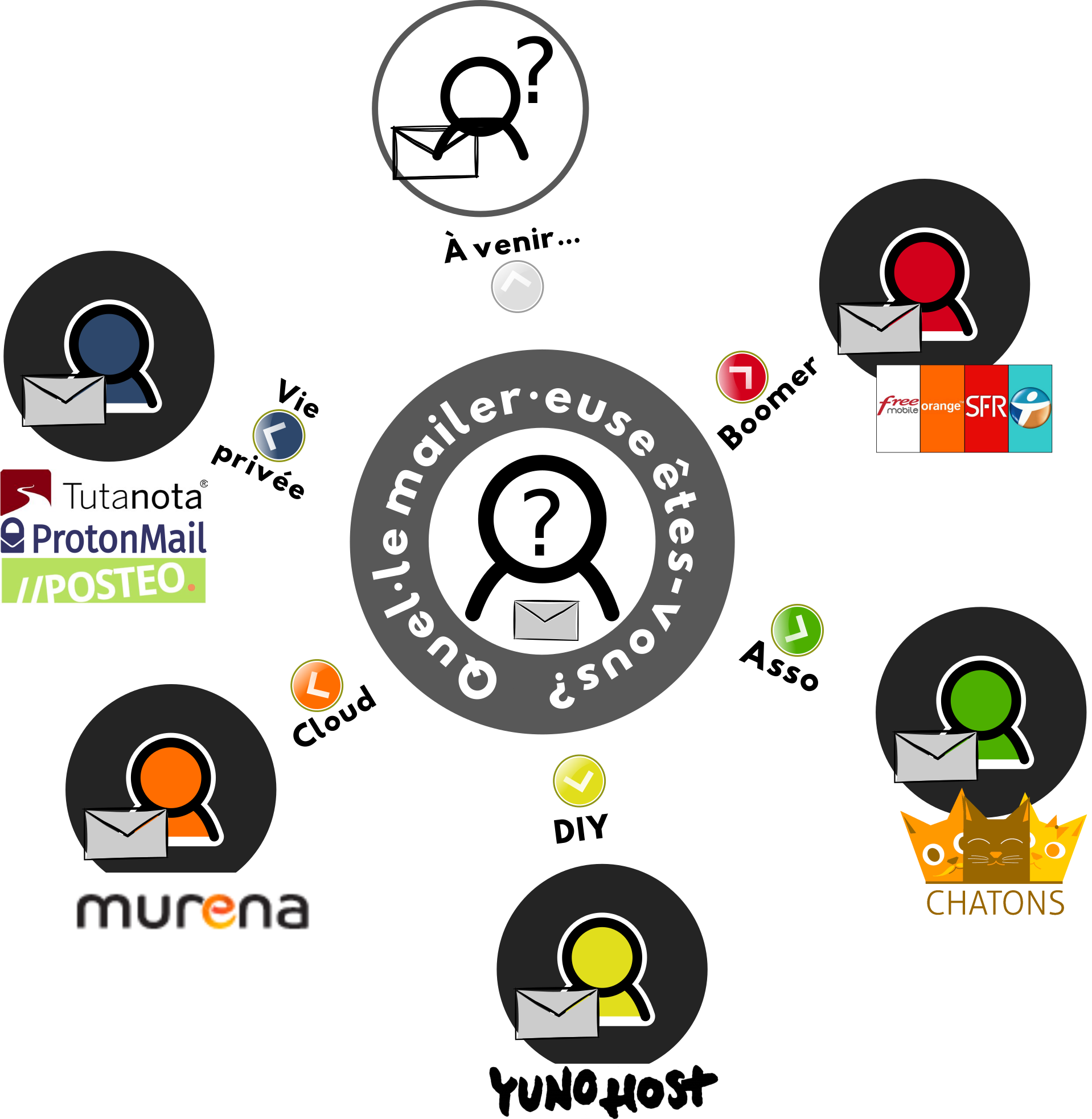♦ Suis-je prêt·e à payer pour ce service, s'il est important pour moi ? ♣ Souhaitez-vous confier vos mails à une entreprise ? Coopérative ? Association ? S'auto-héberger ? ★ Souhaitez-vous que le fournisseur soit basé en France ? En Europe ? Localement ? • Quel niveau de confidentialité avez-vous besoin ? (chiffrement de bout en bout ou non, selon la sensibilité de votre activité pro/perso ?) ☆ Avez-vous besoin d'un nom de domaine à votre nom (monidentifiant@mastructure.fr) ? ∼ Avez-vous besoin d’accéder à vos méls depuis plusieurs appareils, connectés ou non au réseau (téléphone/ordis/etc) ? × Avez-vous besoin d'alias (poubelle@mastructure.fr) ? ♠ Quelle est la taille du stockage dont vous estimez avoir besoin ?